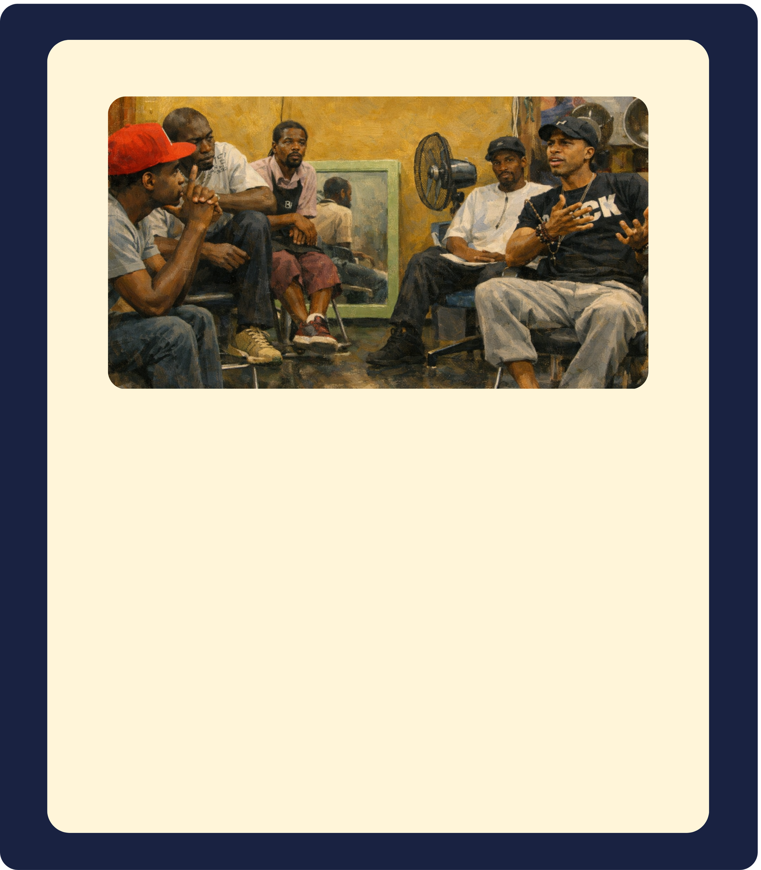 Casual community meetups in local barbershops where fathers can speak on real-life topics in a relaxed setting. Filmed for recorded for podcast or video series.