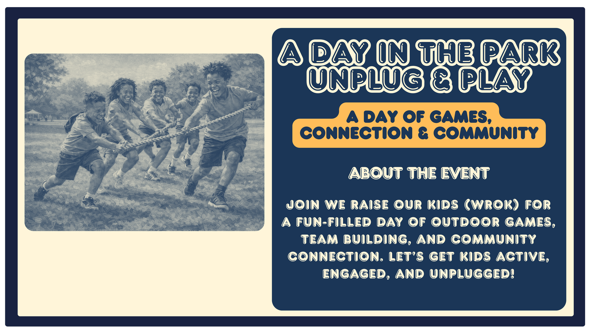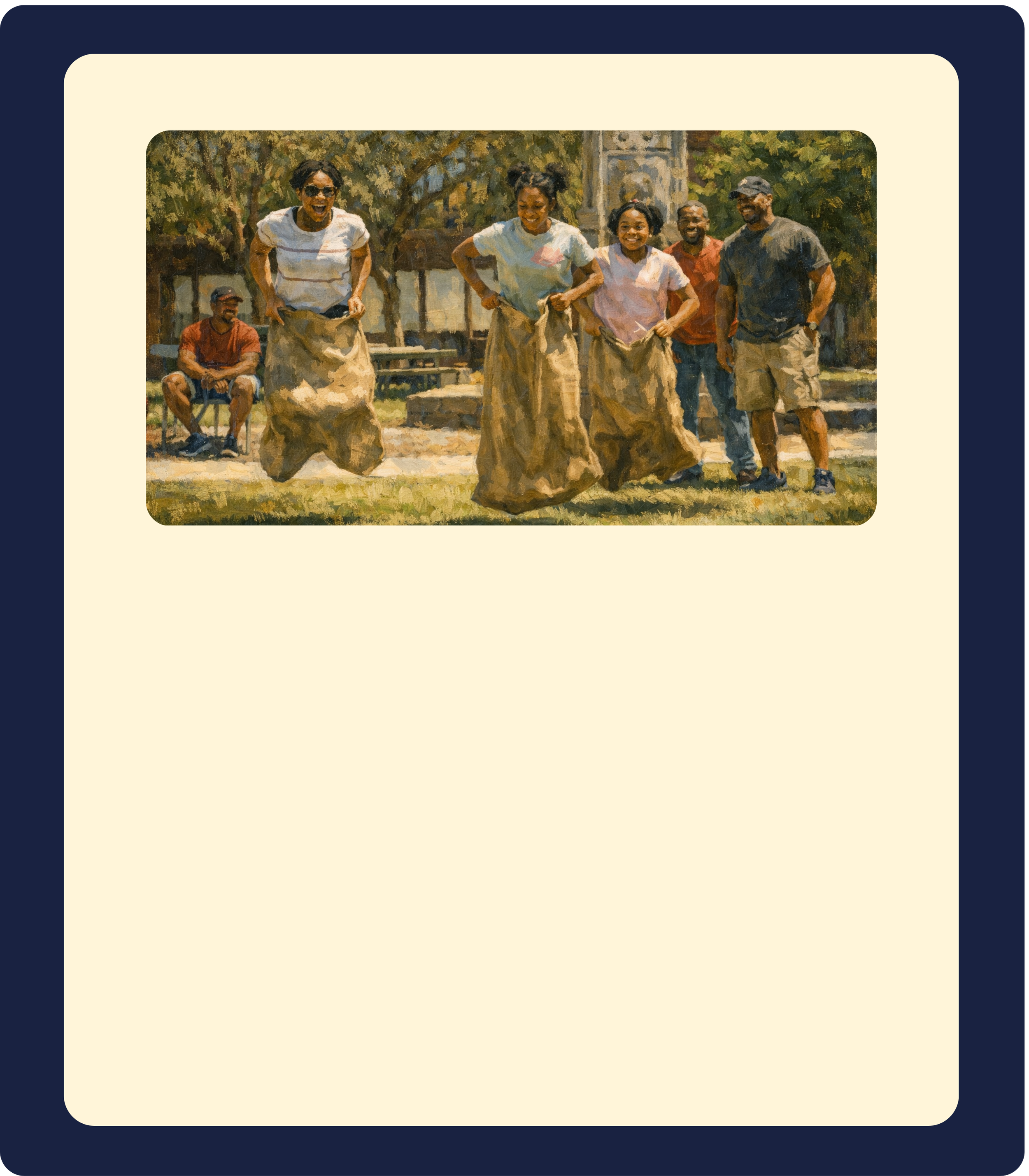 A full day of games and outdoor activities where dads team up with kids to compete, learn, and laugh together — includes sack races, tug-of-war, and mentorship moments.