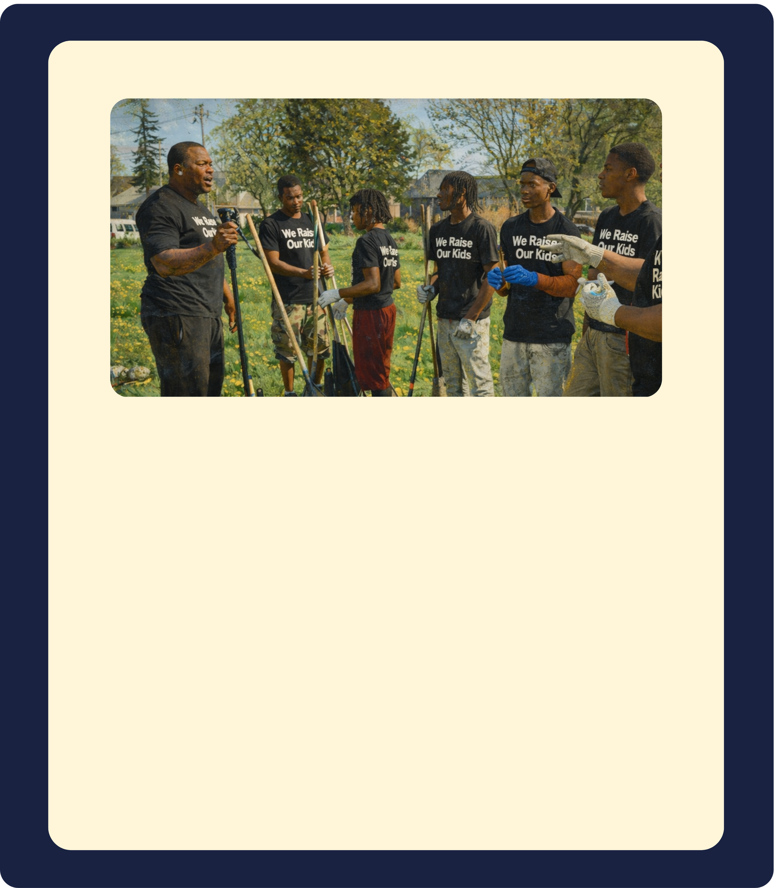 A community service initiative where dads and kids volunteer together — from cleaning parks to painting murals — reinforcing responsibility and pride in their neighborhood.